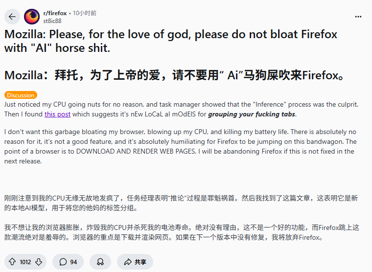 Firefox 浏览器新 AI 功能遭用户吐槽:又耗电又卡